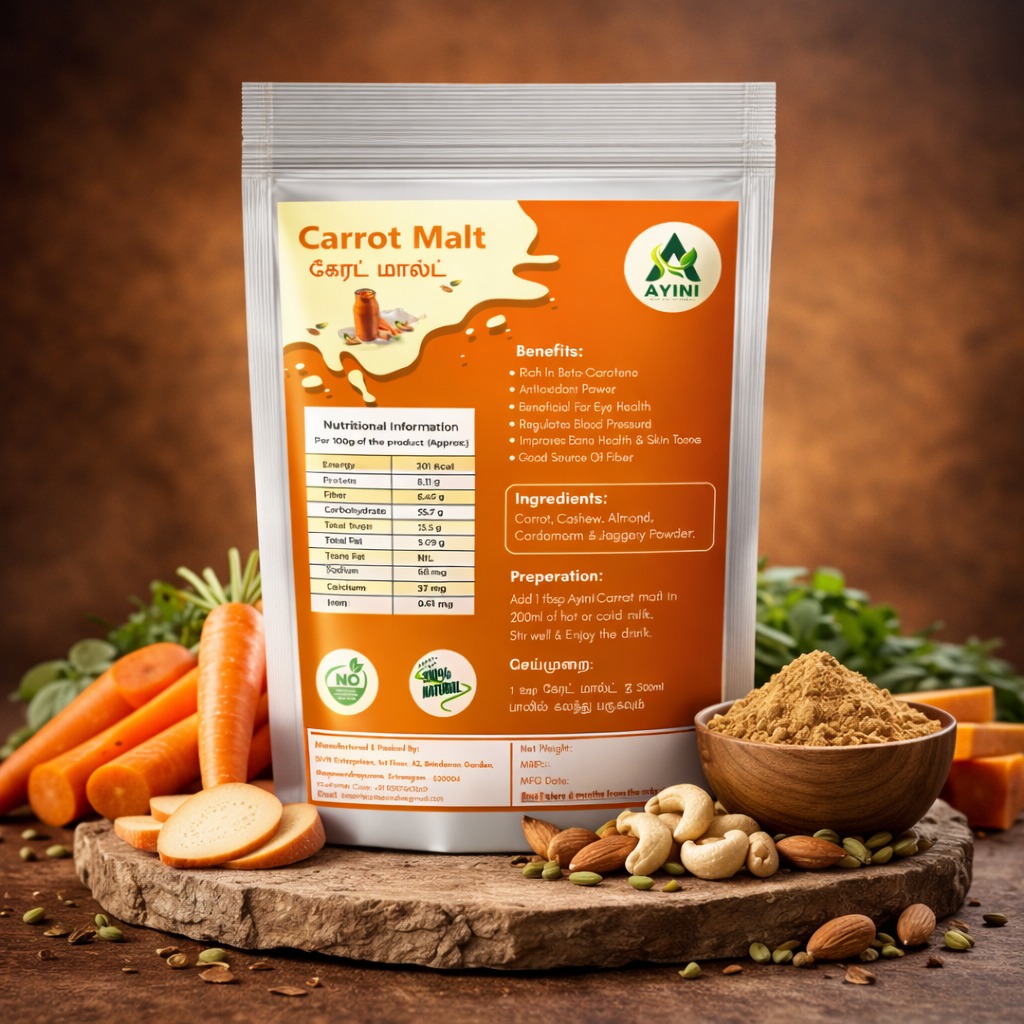 Ayini Carrot Malt is a nutritious and tasty health drink mix designed to offer a convenient way to enjoy the benefits of carrots. Made from dehydrated carrot powder blended with wholesome ingredients, it delivers both flavour and nutrition in every sip.
