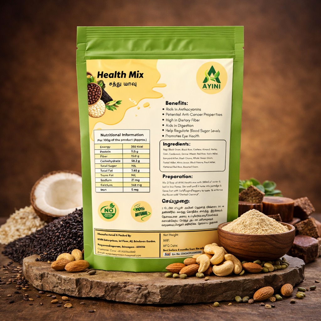 Ayini Health Mix is a well-balanced blend of natural grains, pulses, and nuts designed to provide complete nutrition. It supplies essential vitamins, minerals, protein, and fiber to support a healthy lifestyle.