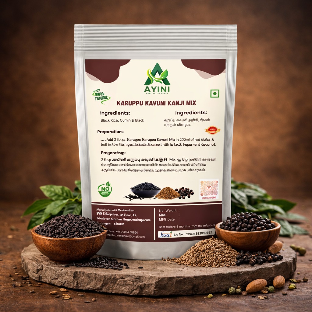 Ayini Karuppu Kavuni Kanji Mix offers a convenient way to enjoy the traditional health benefits of Karuppu Kavuni rice, also known as “Forbidden Rice.” This nutrient-rich mix creates a comforting porridge packed with antioxidants and essential nutrients.
